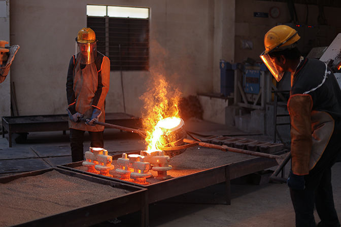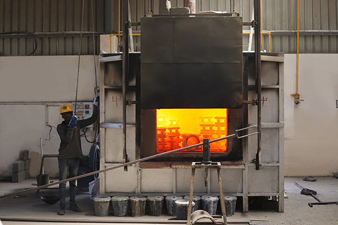 - Molten metal is poured into the preheated ceramic shell. The metal flows through the sprue and into the cavities left by the wax patterns, capturing all the intricate details of the part. Our melting shop is equipped with INDUCTOTHERM induction furnaces, featuring 150KV and 300KV crucibles.