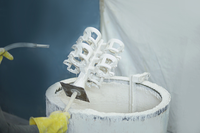 - The wax assembly is dipped into a liquid ceramic slurry, coating the entire surface. Once the slurry dries, it is covered with fine ceramic sand using materials like zircon flour, fine sand, fused silica, and colloidal silica (water-based). This process is repeated several times with progressively coarser layers to build a strong and durable shell around the wax patterns.