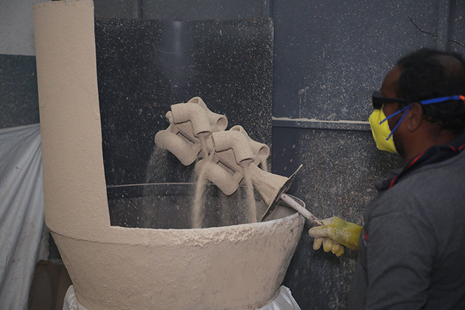 - Once the metal has fully solidified, the ceramic shell is removed using vibratory equipment. Any remaining shell material is eliminated through sandblasting or other in-house cleaning processes.